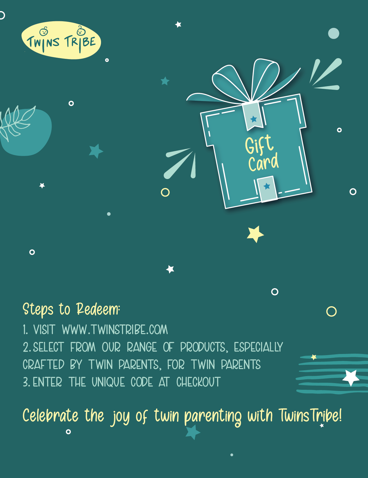 TwinsTribe Gift Card is the perfect solution for anyone seeking a thoughtful and versatile gift for the charming duo in their life! Our thoughtfully curated portfolio, crafted by experienced twin parents, caters to the unique needs of twin families The TwinsTribe gift card empowers your loved ones to choose exactly what they want from our diverse selection of products; products that not simplify the twin parenting journey but also celebrate the beautiful bond shared by the dynamic duo.