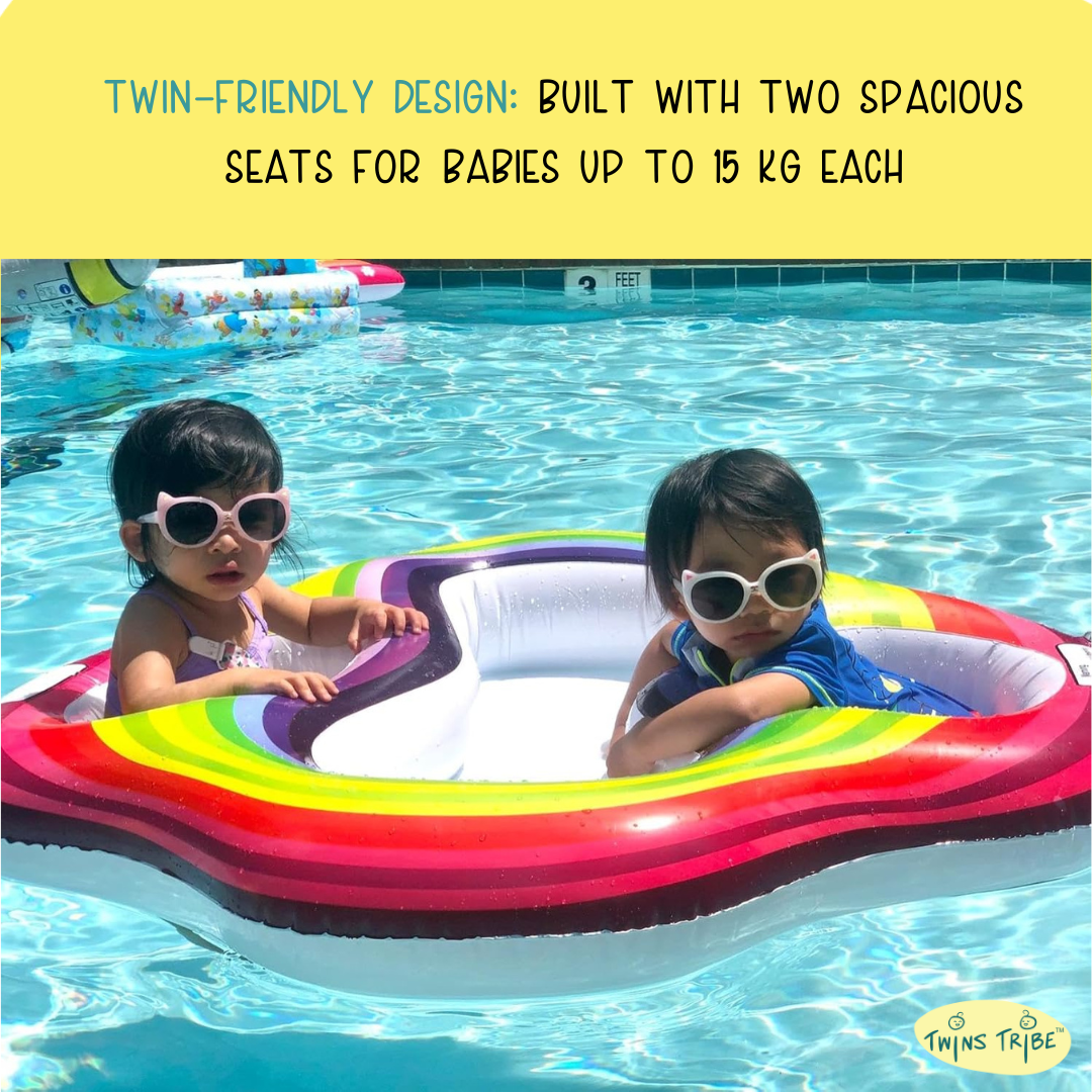 🌈 Twin-Friendly Design: Built with two spacious seats for babies up to 15kg each, this float ensures both your little ones can safely enjoy the water together — with equal fun and comfort.