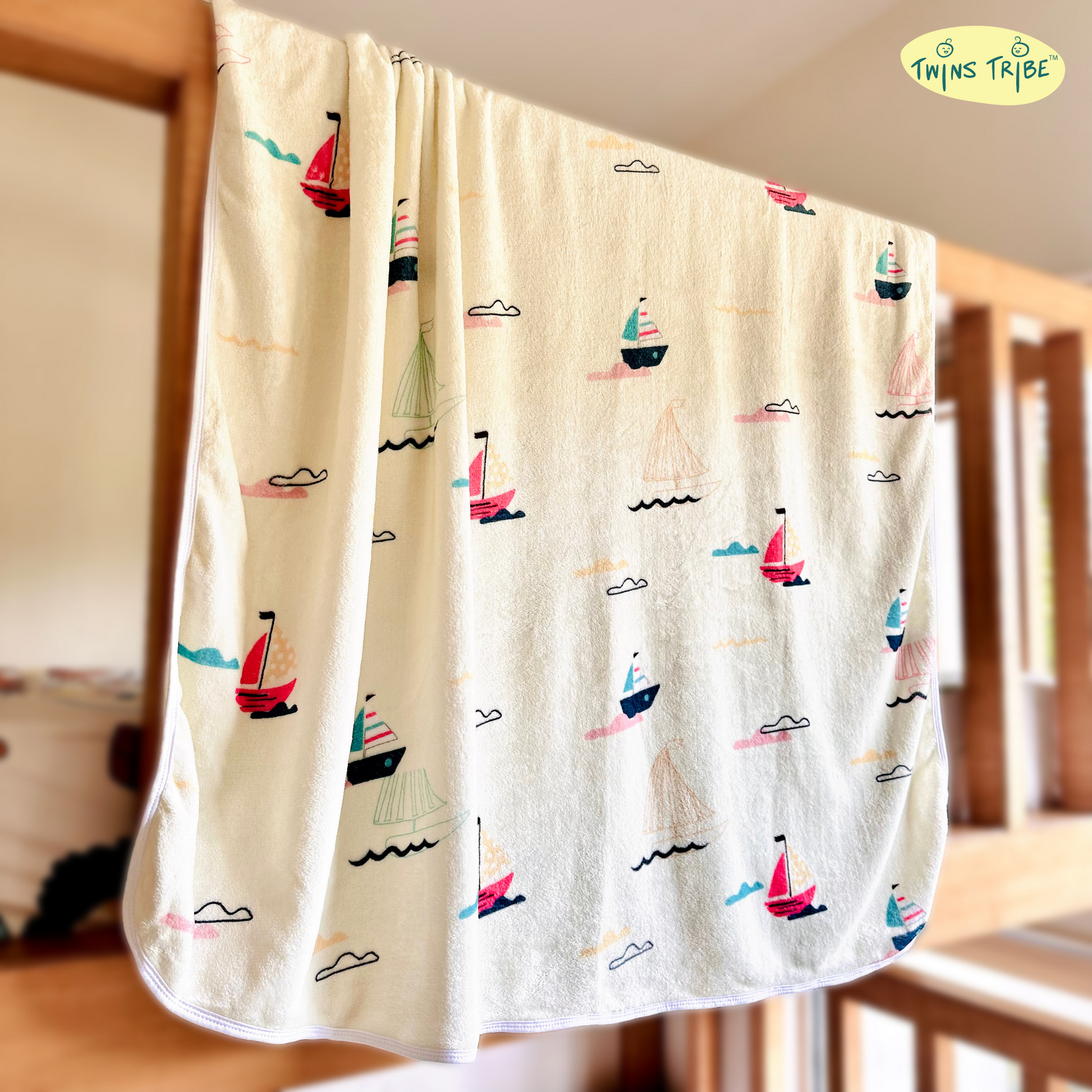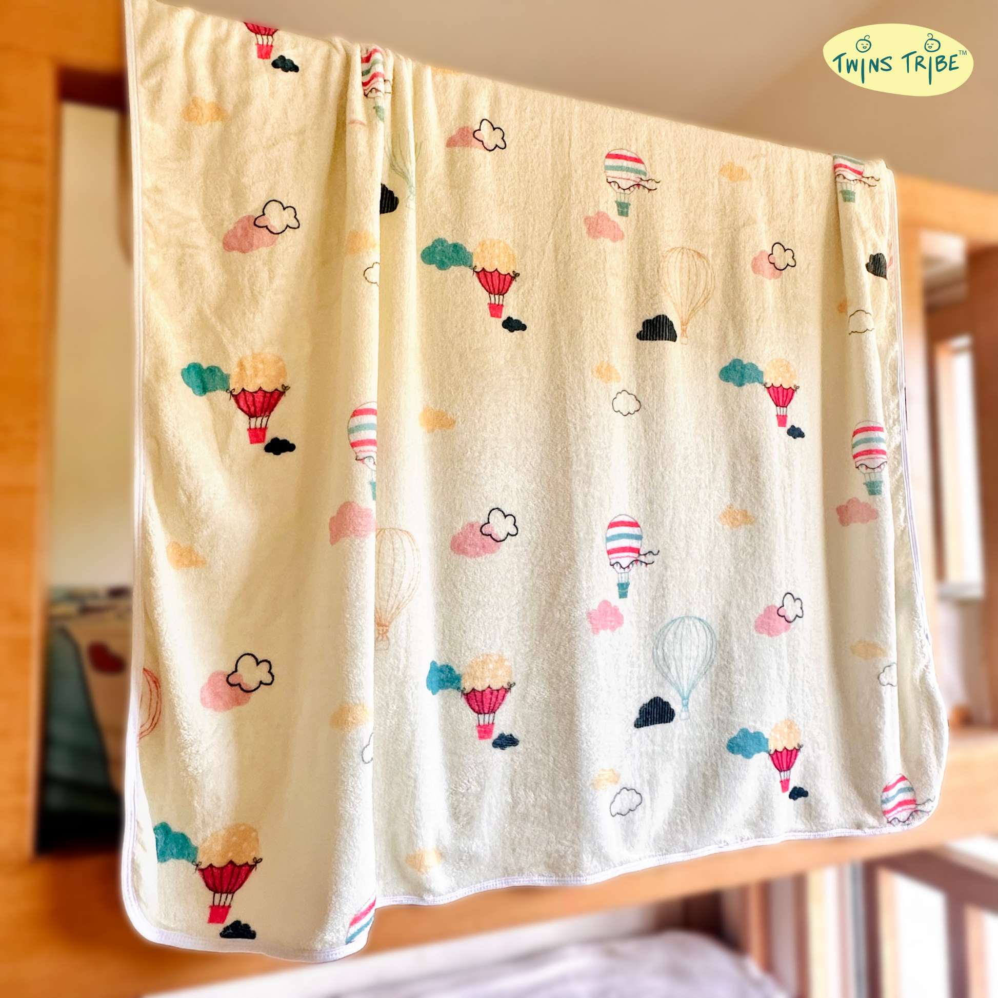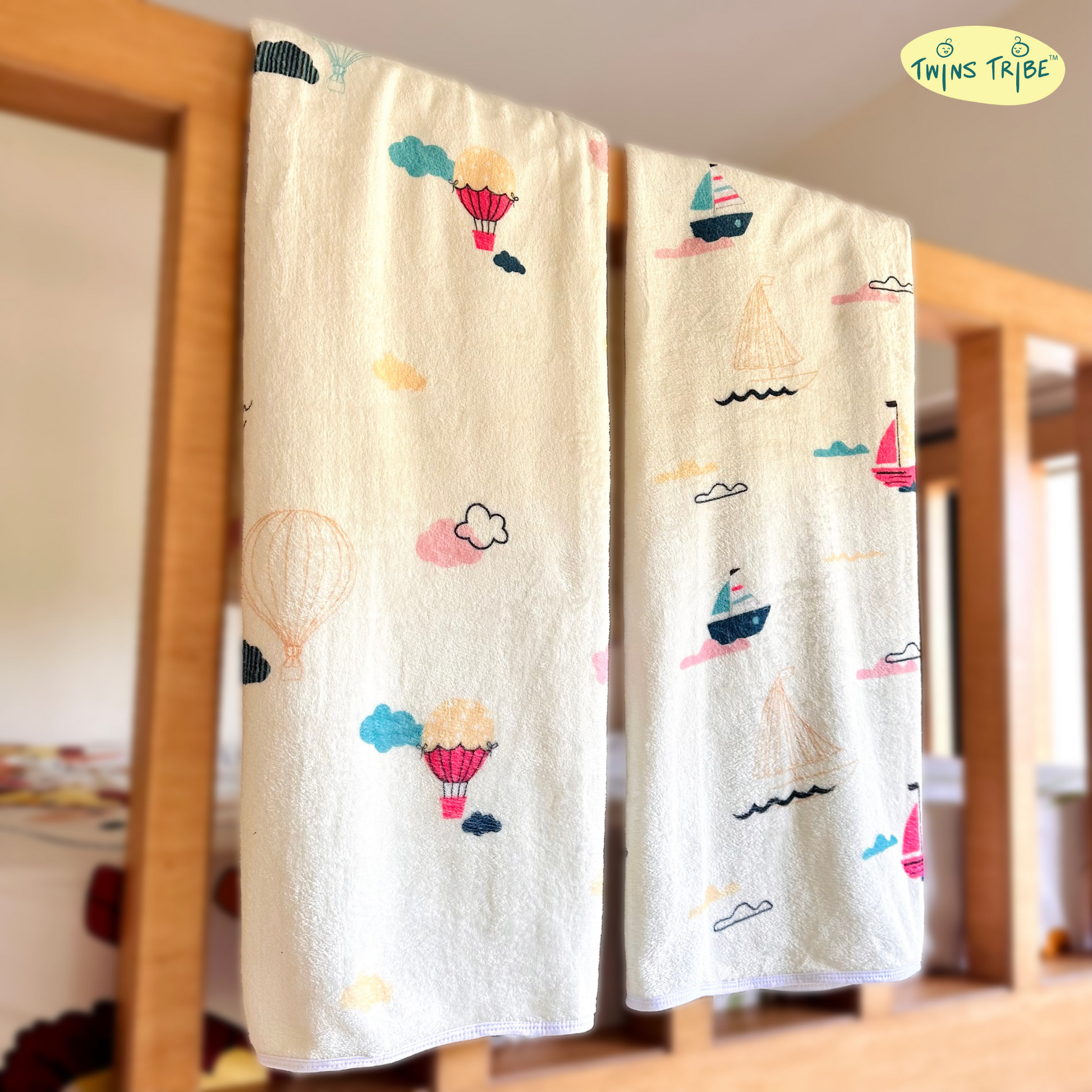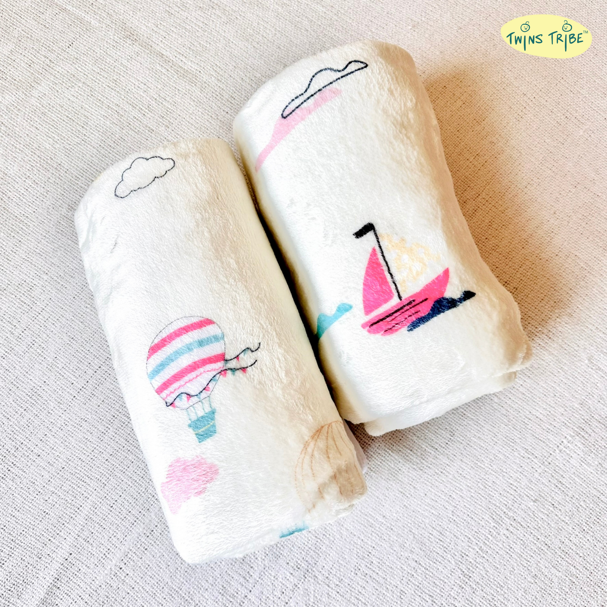 Introducing the TwinsTribe Twins Blankets Set in delightful Float Away print. This charming set includes two cozy blankets, featuring the enchanting combination of a Hot Air Balloon and a Sailboat.