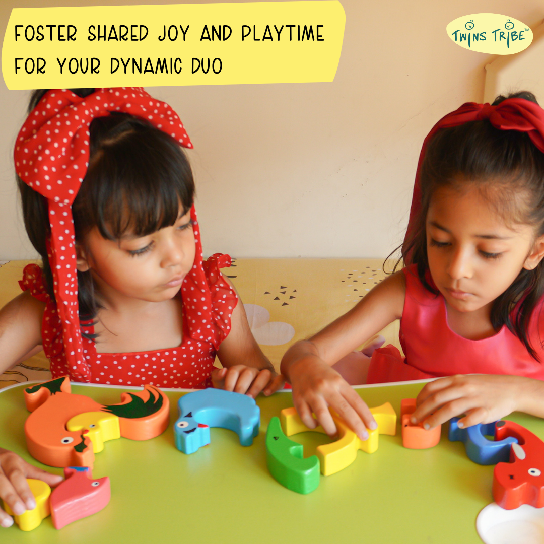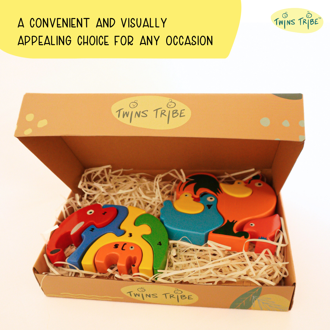 Introducing the TwinsTribe Animal Family Jigsaw – a captivating wooden puzzle gift set specially tailored for twins. Make gifting a breeze with our thoughtfully curated ready-to-gift toy sets, encouraging your dynamic duo to embark on a journey of exploration and creativity together.