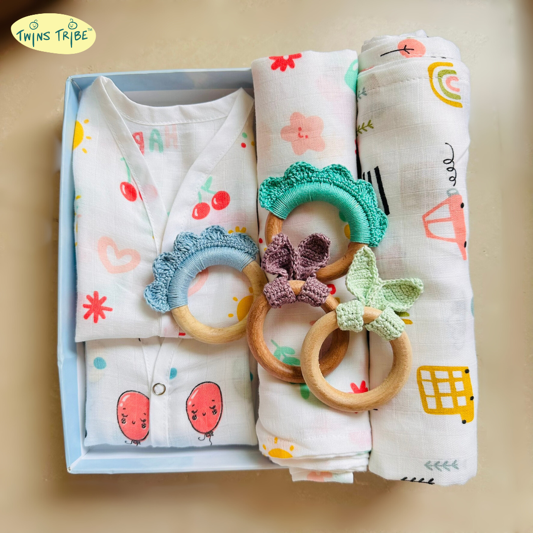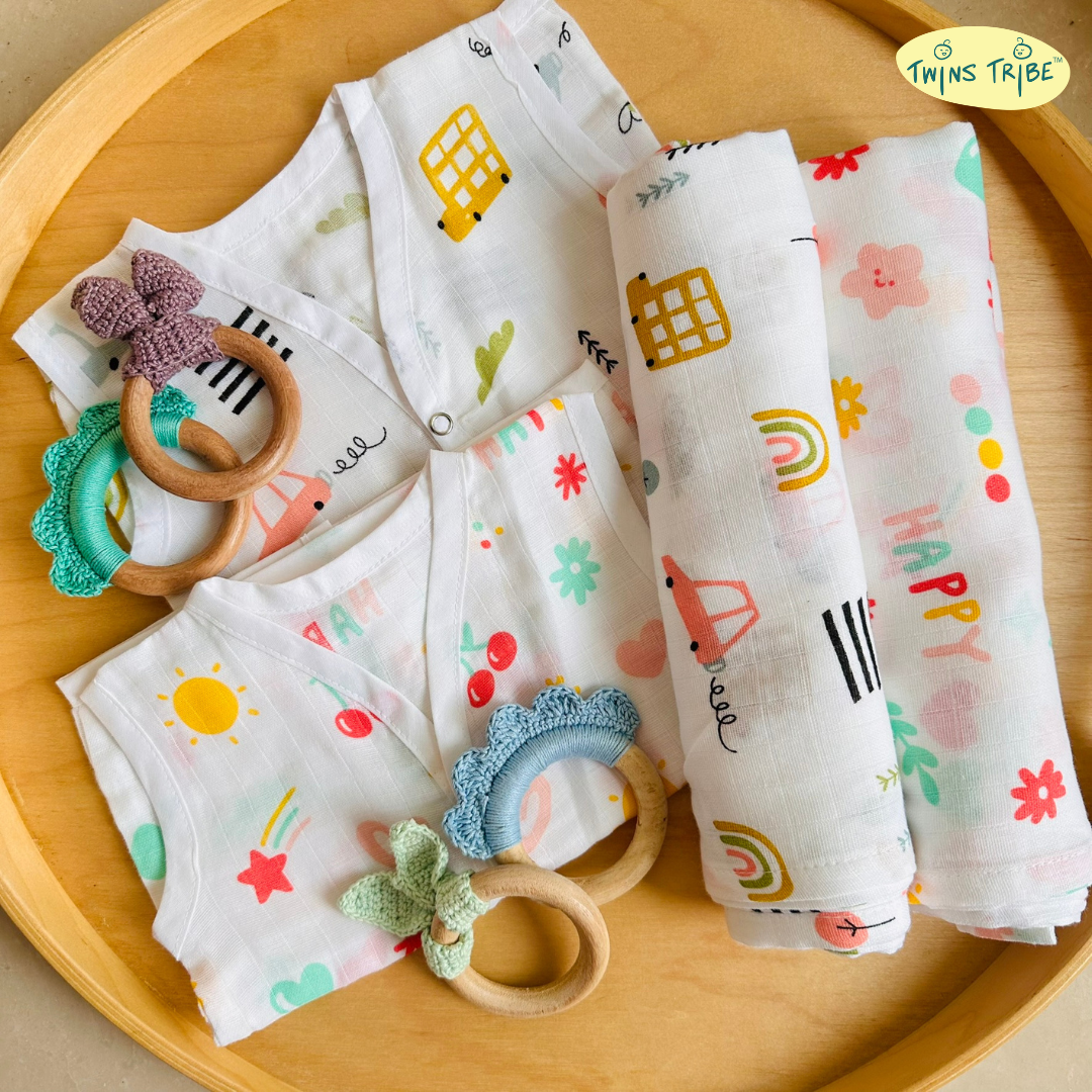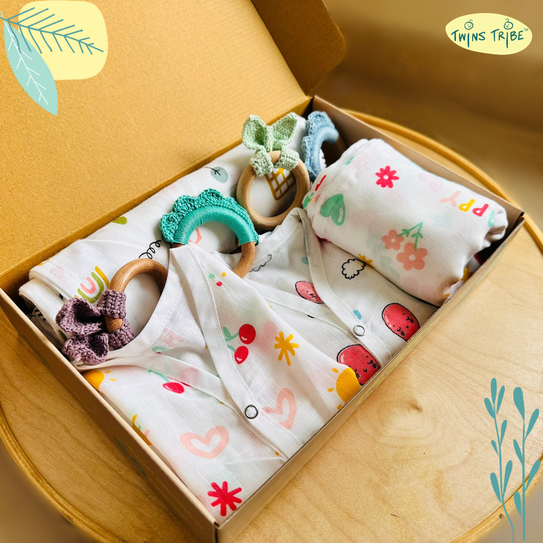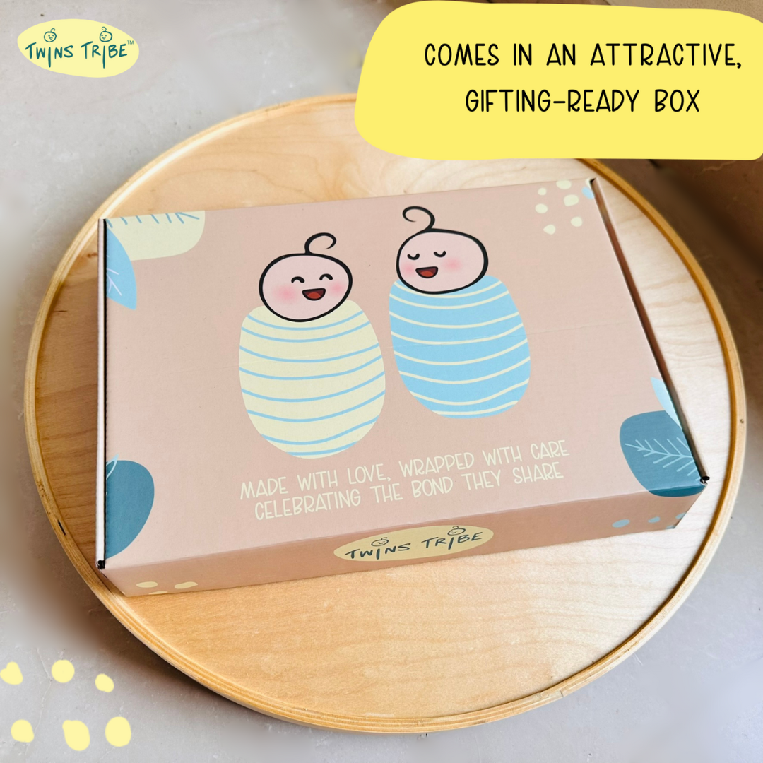 Give the gift of comfort and care with the TwinsTribe Double Delight Combo Gift Set—a thoughtfully curated set designed for newborn twins. This set combines ultra-soft essentials to keep babies cozy, safe, and happy.