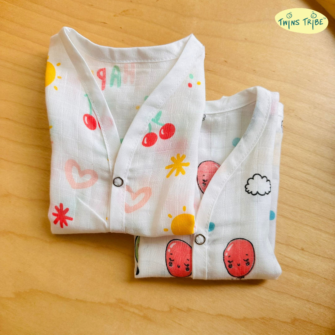 - 2 Muslin Jhablas (0-3M) – Front-opening, irritation-free jhablas with easy snap buttons and adorable prints.