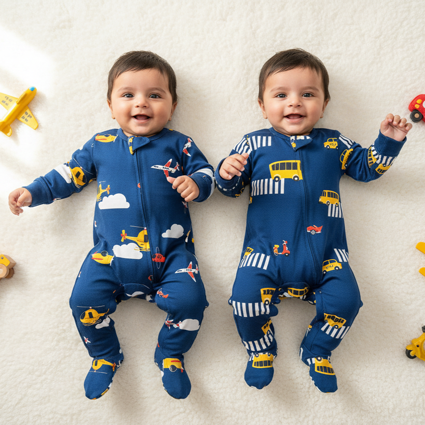 Introducing the TwinsTribe Twins Rompers Set – featuring the captivating combination of Wheels & Wings!