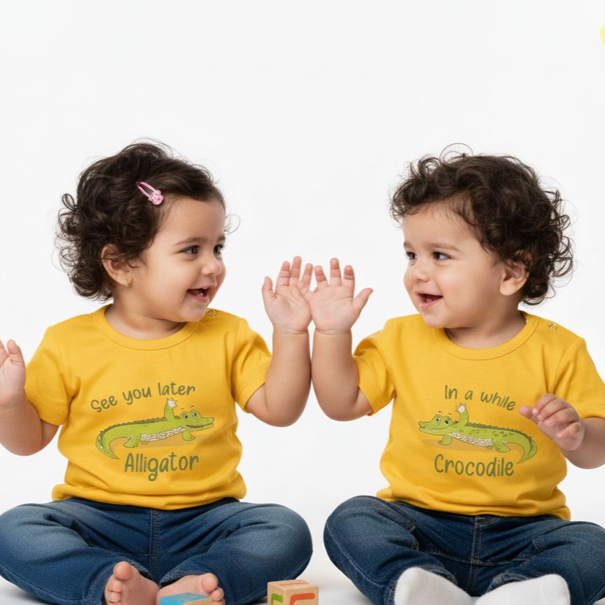 Our delightful set features two charming tees designed to complement each other perfectly. With the playful phrases "See You Later Alligator" and "In a While Crocodile," these clever and catchy tees are sure to bring smiles and laughter wherever your twins go.